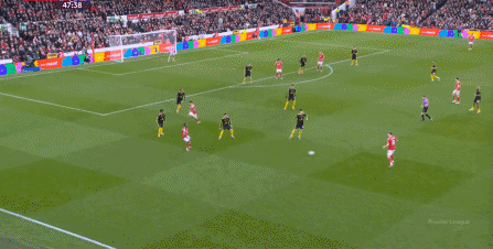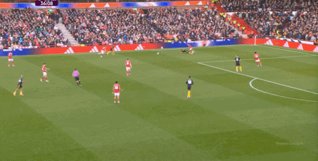 第48分钟,诺丁汉森林左右调动曼联,在右侧禁区角的位置起脚传中,欺负到了阿玛德-迪亚洛的头顶: